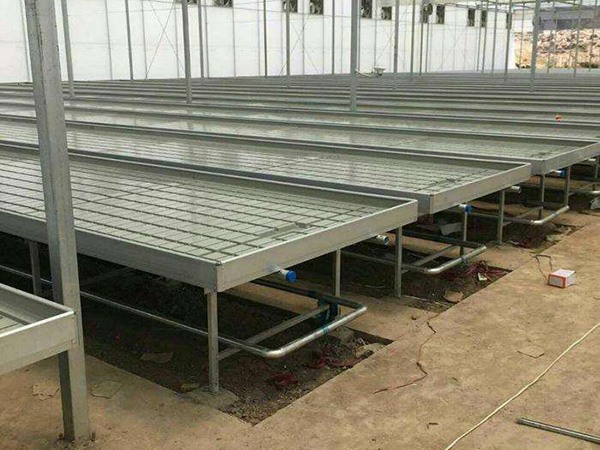 潮汐苗床是一種床面為塑料結構的栽培床,其床面采用塑料制作的潮汐式苗盤,它又稱底部灌溉式栽培床。這種潮汐式灌溉移動苗床采用基本與商品化金屬結構栽培床相同的立柱、支撐,床面采用模壓成型的不透水塑料苗盤。灌溉時,苗盤內注滿清水或營養液,并使其滯留一定的時間,以使作物依靠毛細作用通過花盆底部的排水孔吸收水分。之后灌溉水排出栽培床,或收集再利用,或直接排到當地的下水管道。